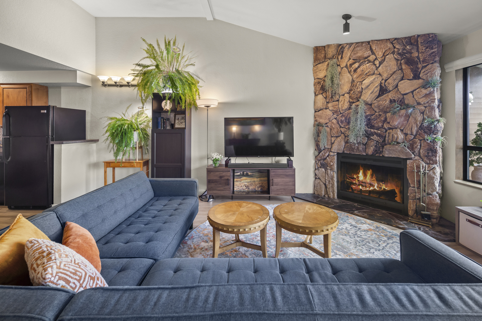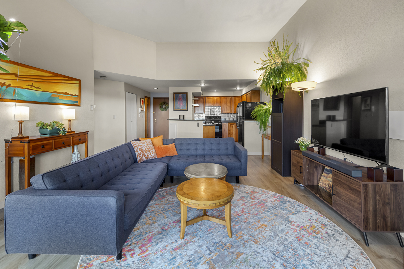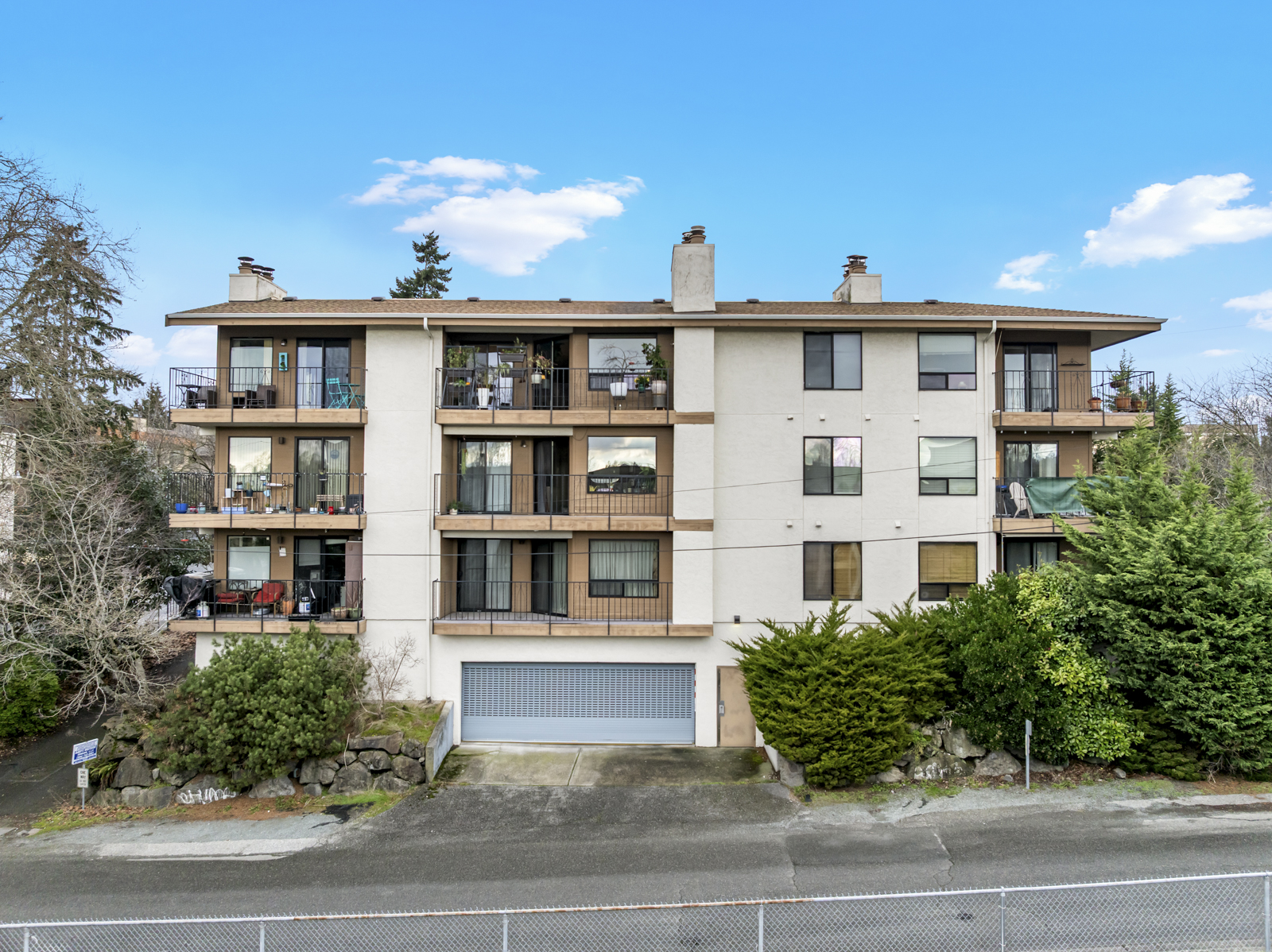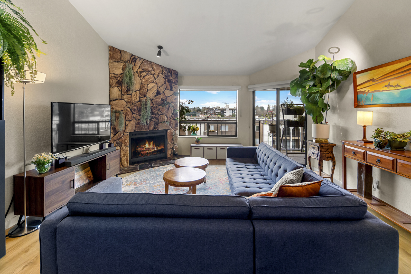 Discover this amazing top-floor condo with soaring 12' ceilings, great natural light, and spacious rooms. Step inside to an open floor-plan, walls of glass, wide plank floors, dramatic floor-to-ceiling stone fireplace. The kitchen opens to a comfortable great room, perfect for everyday life and entertaining. Retreat to a primary suite with walk-in closet, vaulted ceilings, private bath. Outside enjoy the covered deck, perfect for BBQs, morning lattes, or urban garden. Convenient location: walk to shops, restaurants, Kraken Iceplex, movie theater, Light Rail, parks, NSC, more. Between the light rail + easy freeway access this is a commuter's dream. Well-maintained building offers low HOA dues, secure garage parking, storage. Welcome home!