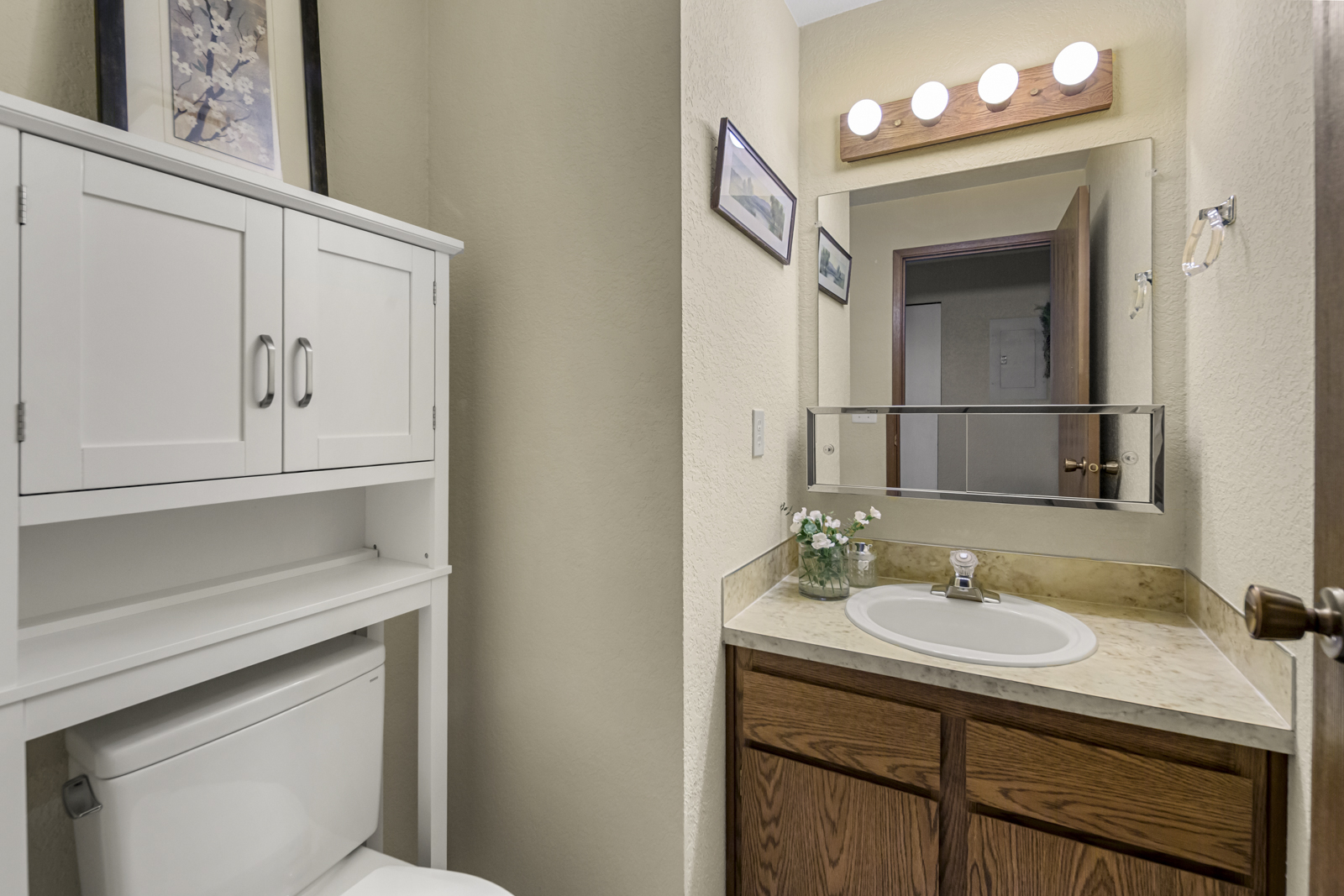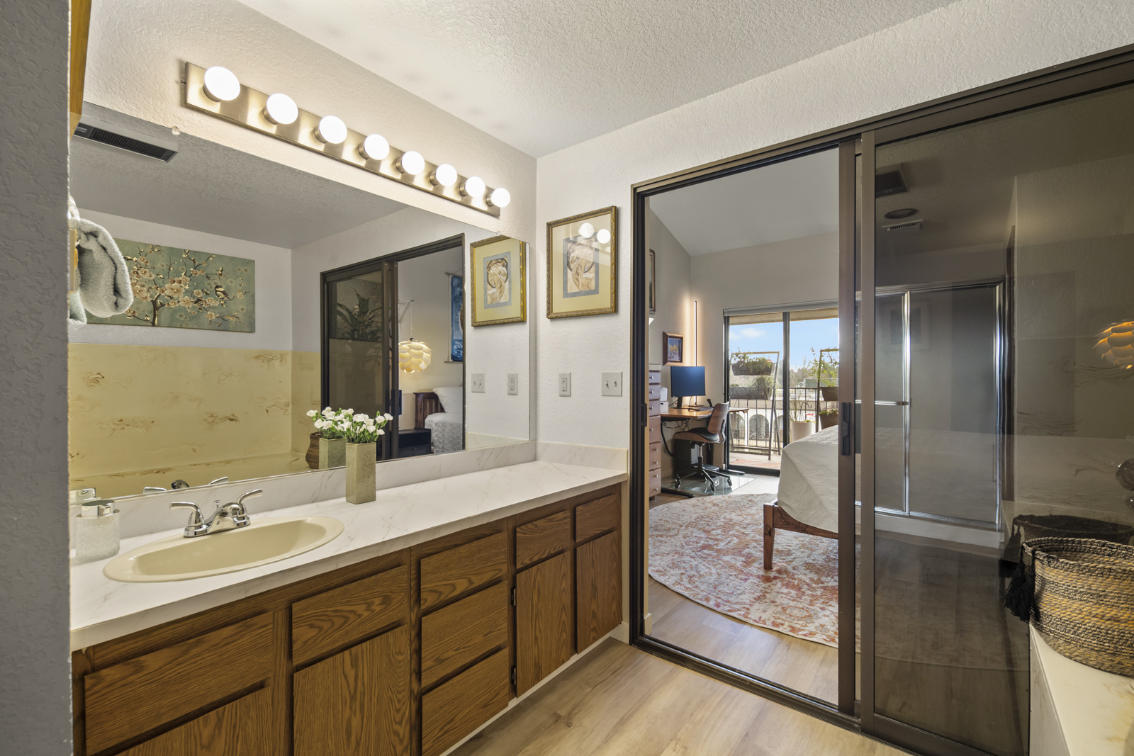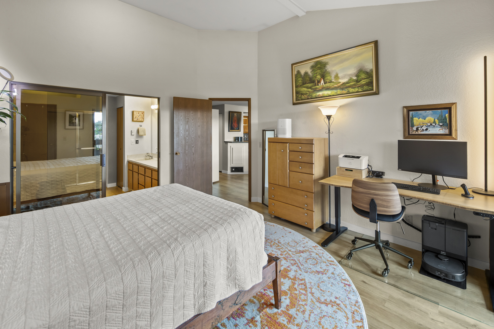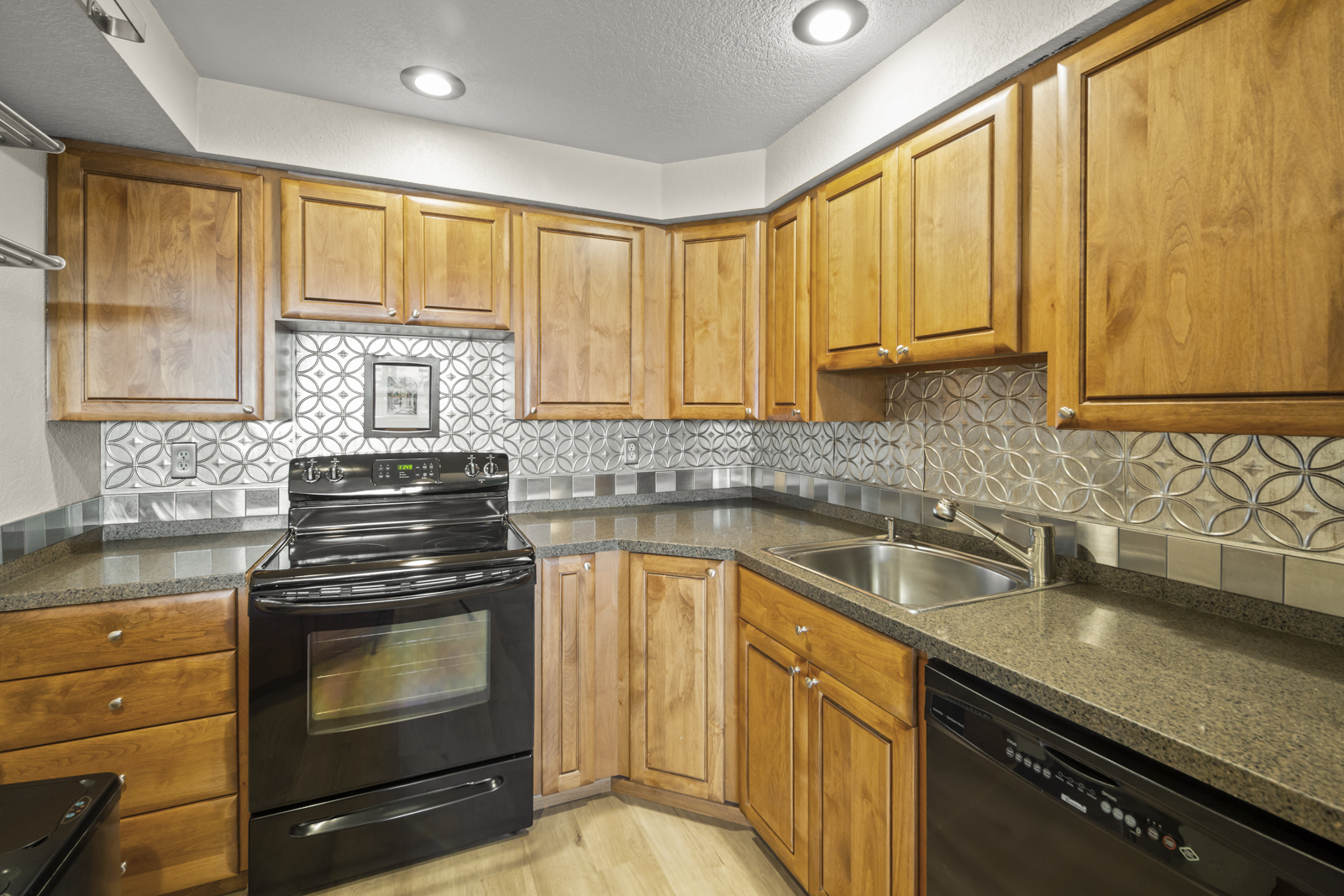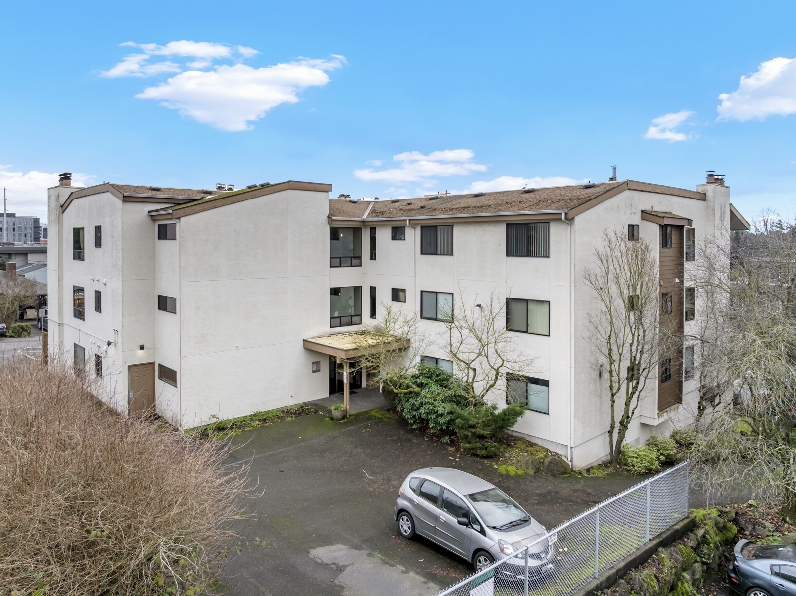 Discover this amazing top-floor condo with soaring 12' ceilings, great natural light, and spacious rooms. Step inside to an open floor-plan, walls of glass, wide plank floors, dramatic floor-to-ceiling stone fireplace. The kitchen opens to a comfortable great room, perfect for everyday life and entertaining. Retreat to a primary suite with walk-in closet, vaulted ceilings, private bath. Outside enjoy the covered deck, perfect for BBQs, morning lattes, or urban garden. Convenient location: walk to shops, restaurants, Kraken Iceplex, movie theater, Light Rail, parks, NSC, more. Between the light rail + easy freeway access this is a commuter's dream. Well-maintained building offers low HOA dues, secure garage parking, storage. Welcome home!